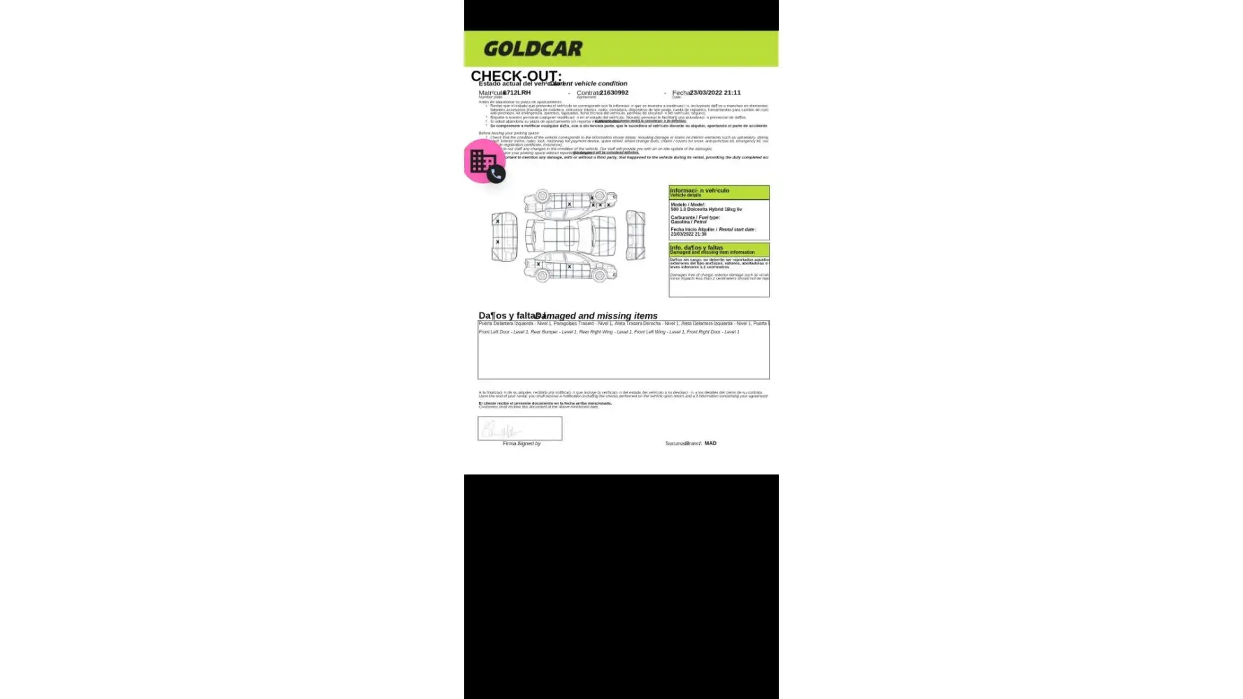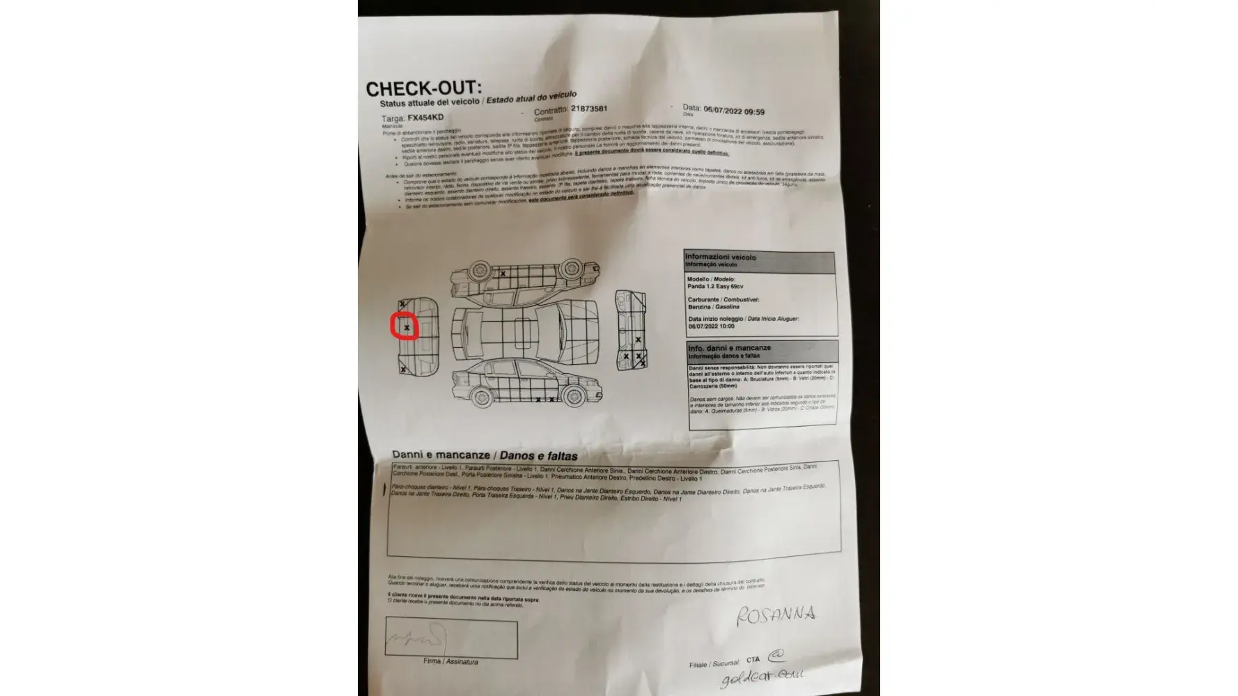 Goldcar states that the damage is new but the truth is it didn't marked any new 'x' on the sketch they sent to justify their charge. Goldcar’s check-in (“doc3â€) and check-out (“doc2â€) documents report marks exactly the same 'X', proving that the damage we are accused of was already there when we picked up the car.