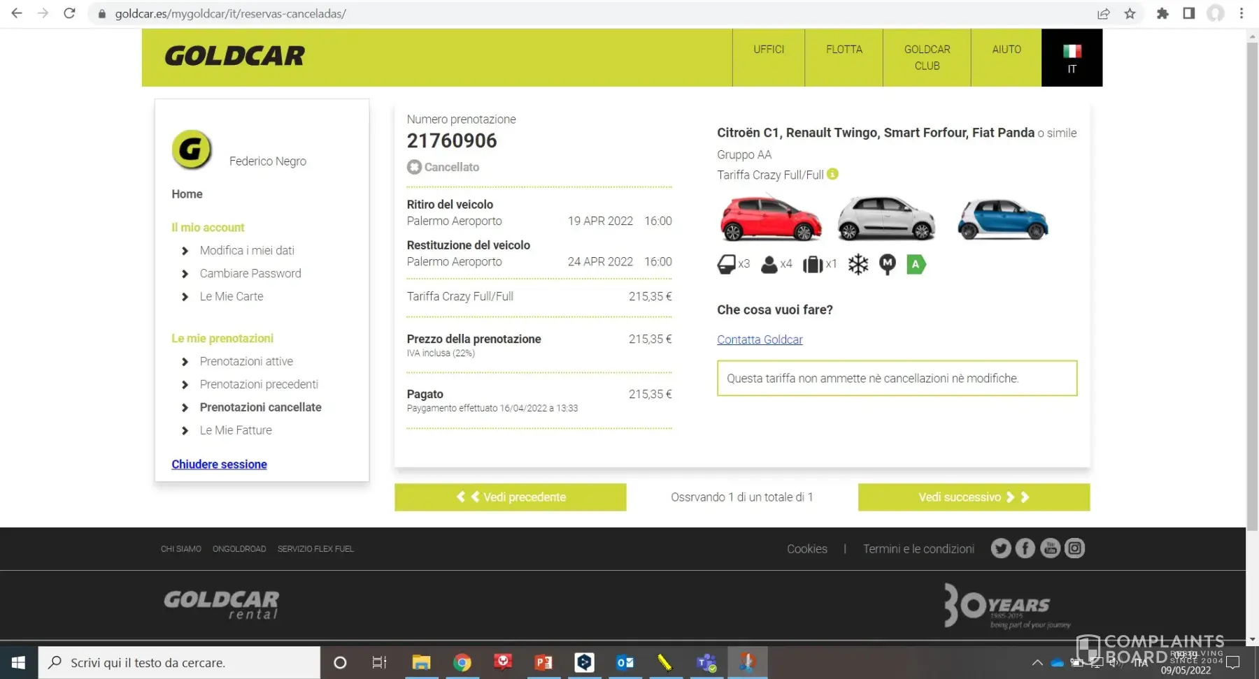 On 2 October 2021 I made a car rental booking through the Goldcar website and prepaid the full amount of €64.61.