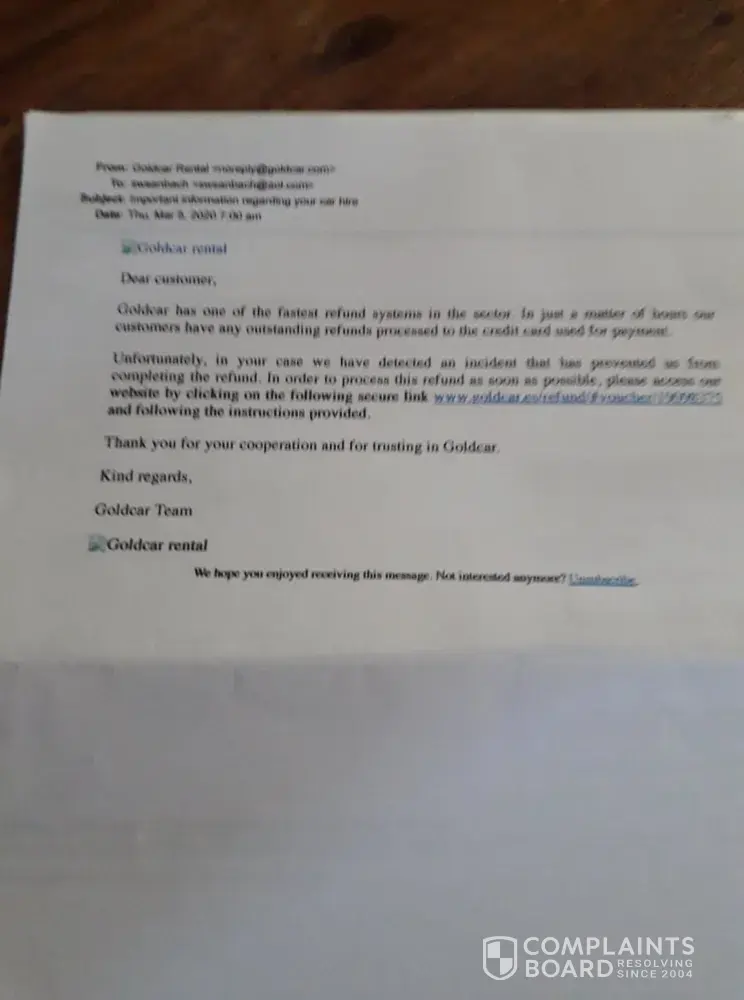 I have now read many online reviews and this seems to be a tactic that Goldcar (also operating as Interrent) uses regularly. It appears that they hope customers will give up and stop chasing. Of course, I want a refund however I also want this company to be exposed for shameful and dishonest practices