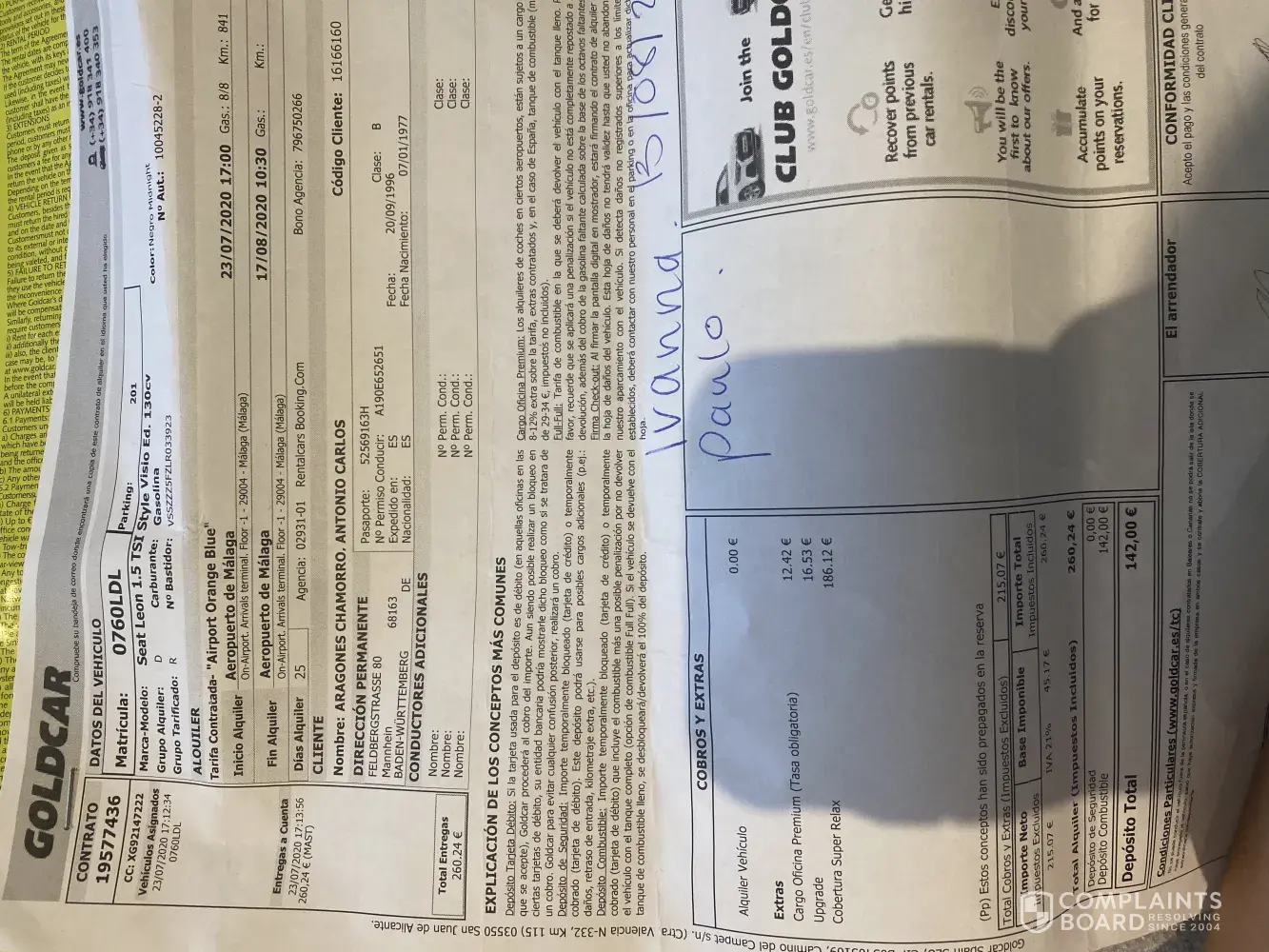 At the Goldcar desk I paid €368.60 and was told this included a damage deposit and fuel deposit, all reimbursable if car returned with a full tank and in damaged. Contract number provided was [protected] dates 24/7/20.