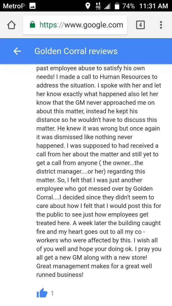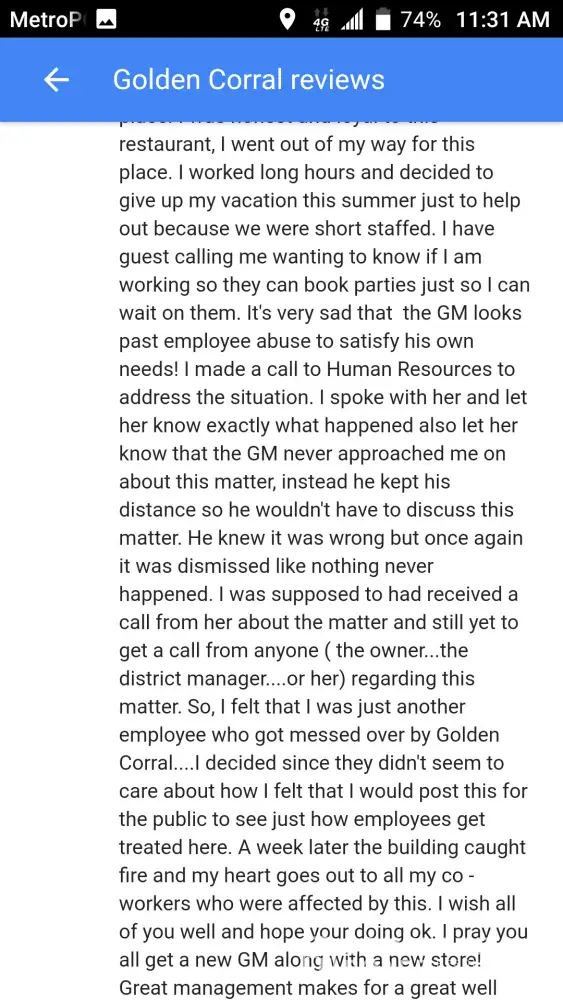 You can view my complaint on Golden corral in Columbus Georgia web site...reviews. look for the T...I was a long time employee and I want answers as to why other team members are allowed to put there hands on people and still keep their jobs. I couldn't seem to get the owner, human resources, or the district manager to return my call about my concerns...if at all possible can someone from corporate office love me answers...please and thank you![protected]...Terry Gage