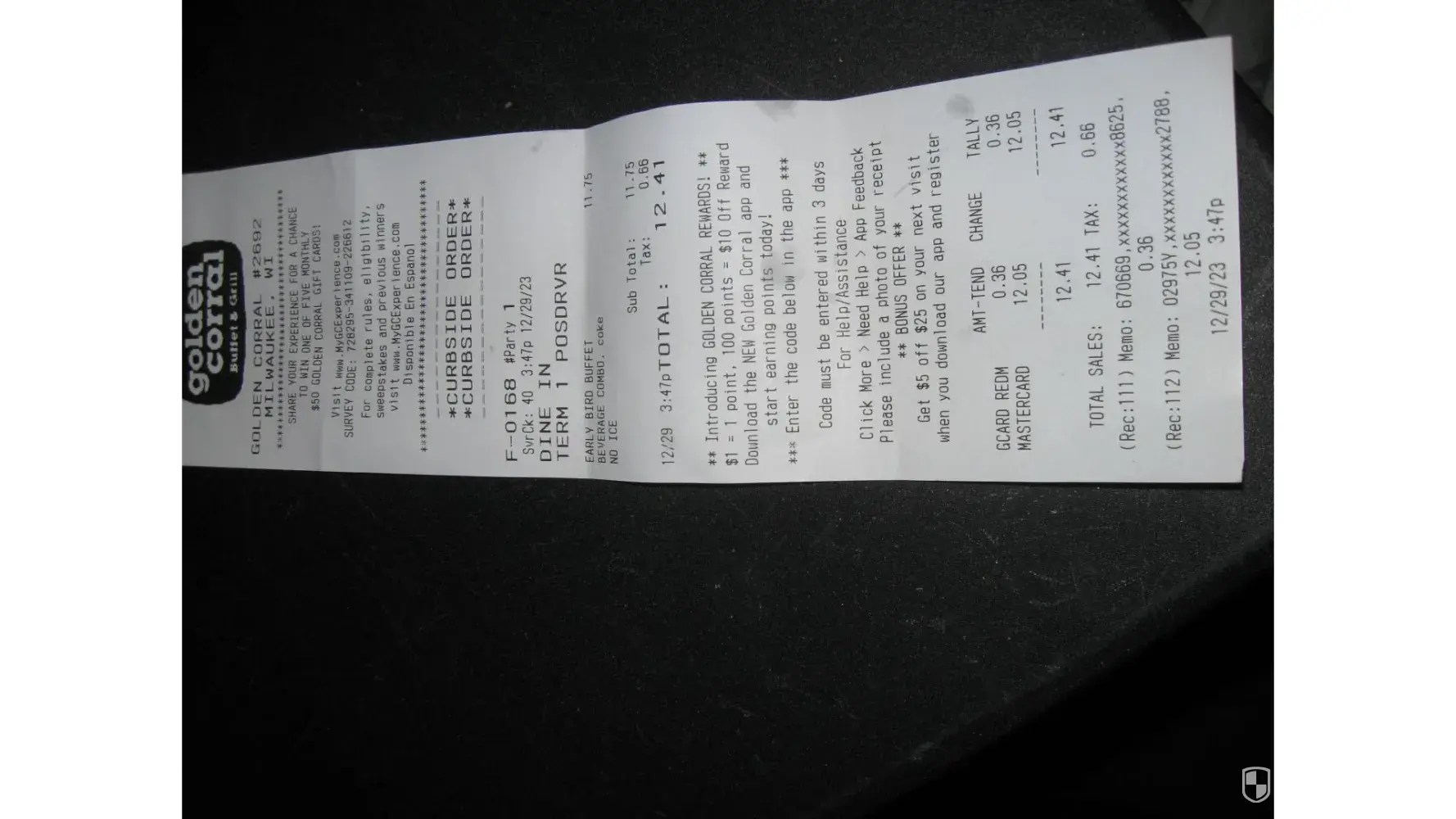 Receipt dated 12/29/2023 at store #2692 , 300 W. Layton Ave ,Milwaukee WI did not have the code printed on it for GOLDEN CORRAL REWARDS.