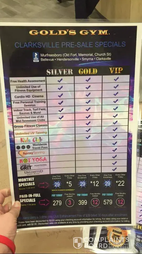 Golds Gym of Clarlsville Tennessee falsely advertised that their new gym opening would have unlimited UV tanning, spray tanning, sauna and an indoor track. Almost two years later they decided NOT to have those amenities. I am a VIP member and got my membership for those amenities and for child care. Golds Gym was recently denied the daycare license and can only have 14 children in the child care room thus resulting in wait times that exceed over an hour long. The owner refuses to allow members out of their contract due to these issues unless we pay 30 days upfront AND the $99 cancellation fee. I know that these are franchises and unfortunately this location does not operate by the same standards as other locations. It's very unfortunate because this is a military town and the owner is taking advantage of the military and the rest of our community.