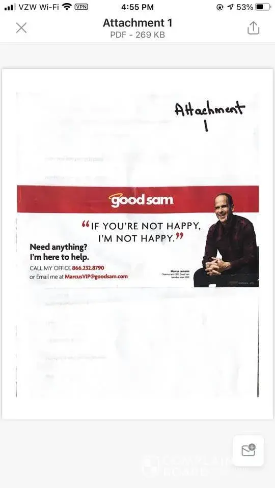 After receiving the marketing material with you name and picture - see Attachment 1, we decided to reach out to you and express our extreme disappointment with the service we have received from Good Sam. Your flyer says, "If you're not happy, I'm not happy." Well, we are not happy.