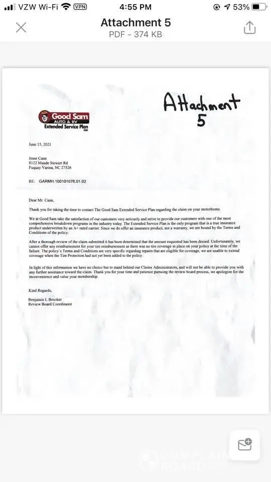 On June 15, 2021, we received a letter from Benjamin L. Brooker, Review Board Coordinator, Good Sam Club, indicating that our claim was being denied - see Attachment 5. After more than 30 years in management, we have never seen company letterhead that has absolutely no contact information. Good Sam is making a powerful statement using this letterhead. They are making it clear that they do not want to be contacted. This is quite a different message than what your marketing materials convey.