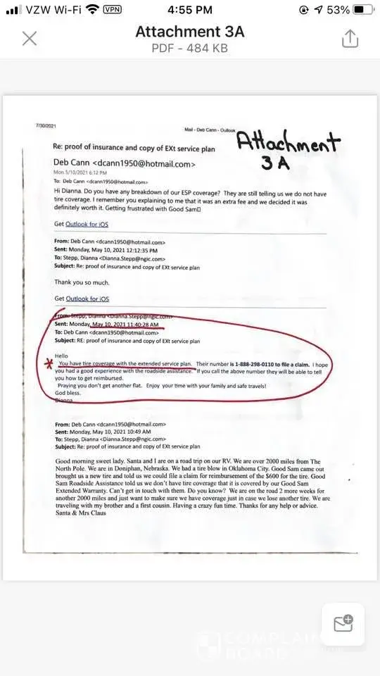 When we called to file the claim, Good Sam informed us that we did not have tire coverage under our Roadside Assistance Plan. We contacted Dianna Stepp, at National General Insurance via email and explained our situation. Dianna was the representative that sold us our Good Sam coverages. She responded to us that we did have tire coverage through our Extended Service Plan - see Attachment 3. Her email to us clearly states that we do have tire coverage. In fact, there are two emails, on two different dates assuring us that we have tire coverage.