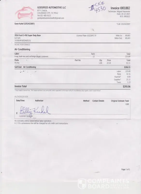 Claimed loss: Parts:A/c Condenser $80.06Parts:A/c Compressor replacement Kit E-450 $270.79Labor: GodSpeed Automotive LLC $293.06