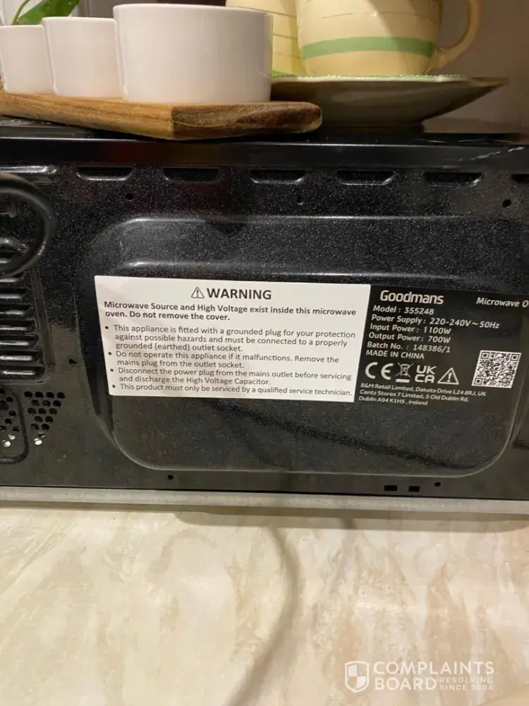 I purchased a microwave from B and M less than 2 years ago. It literally nearly caught on fire today and sparked the whole kitchen smells of smoke. I have filmed this.