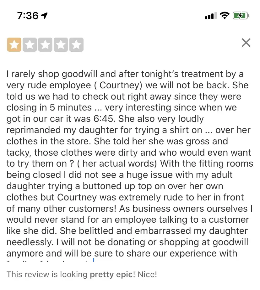I attached a copy of the review I posted about this incident. Courtney from the geneseo il store had my adult daughter in tears after berating her in front of several other customers just for trying on a top over her own clothes in the store. Since the fitting rooms were closed I did not see an issue with this but courtney called my daughter several...