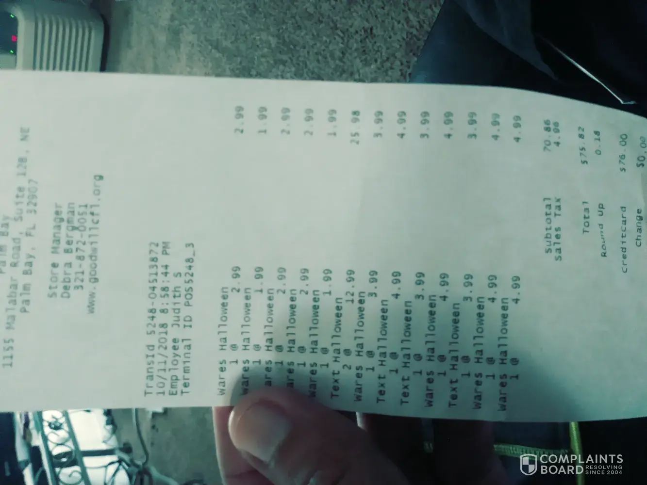 Hello my name is Linette Lopez. I got home from work last night october 11th at 8 at night and headed to goodwills on malabar road because my kids needed halloween costumes for today for school. Cashier name is judith s. And the terminal id is POS 5248_3. I got a pair of gloves that the cashier said they were 2.99 but charged me 4.99 for them. A pair of glasses for 4.99. 2 capes for 3.99 each. A dress for 4.99. And another cape for 3.49 which she charged me 3.99 for it. A crown for 1.99 which she scanned twice. Butterfly wings for 4.99. 3 cigarette holders for 2.99 each. 3 hats of the same one was marked at 4.99 the other one was marked at 5.99 but she didnt mark that price she marked 2 for 12.99 each. Its sad how people take advantage. I ended up paying 75.82 when the total was suppouse to be 51.37 plus tax. I noticed when i got home. It was too late to go back it was closed already. And the saddest part is that the costumes were for today and my kids were excited already so i wasnt going to let them down. I have the receipt and the tags. I dont know if i can do something about it. Thank you in advance.