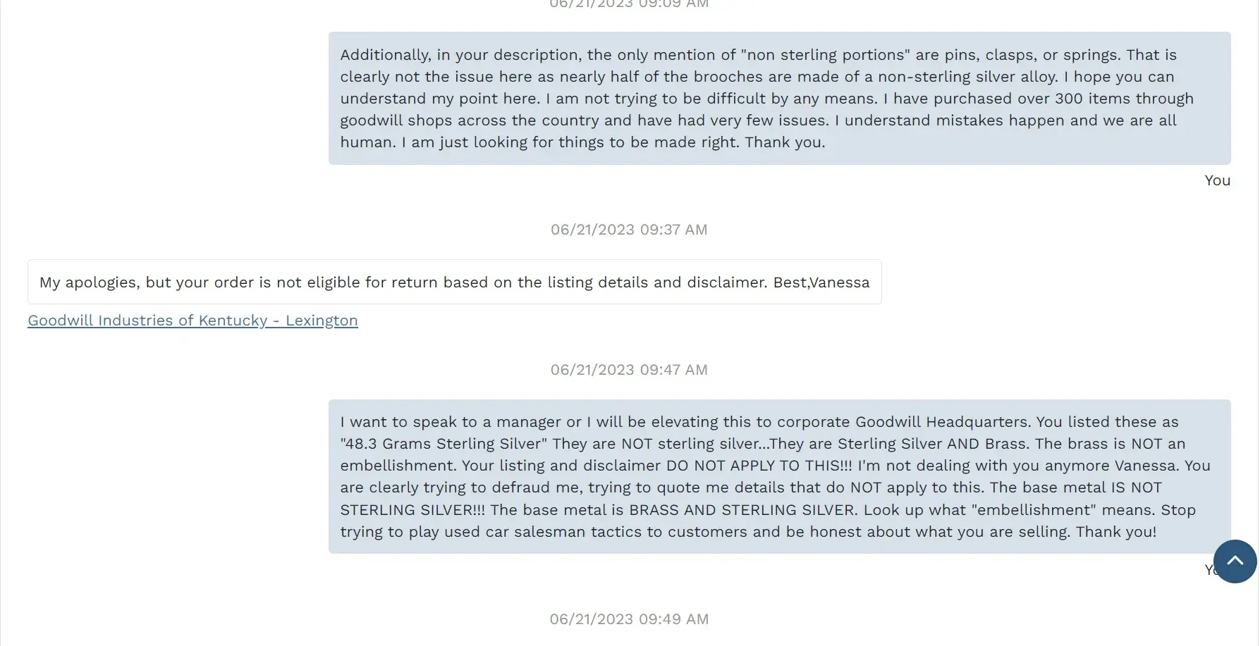 My complaint is against the Goodwill store - Goodwill Industries of Kentucky - Lexington. They sold me a jewelry lot they listed and described as "48.3 Grams Sterling Silver SS925 Mexico Wearable Bracelet & Brooches Pins". Upon further inspection and testing, I found that roughly half of the jewelry is made of brass and copper, and is not 48.3 grams of sterling silver as they listed. I understand that mistakes happen so I informed the store of my findings and sent them proof of my testing. I requested a partial refund or a return label to send the jewelry back to them for a full refund. I was shocked to see their employee Vanessa reject my return request completely, regardless of the evidence I presented. They committed blatant fraud and aren't even trying to hide it. They are trying to say the jewelry brass/copper is an embellishment, like a gemstone. Their policy states jewelry may contain embellishments. However, as can be clearly seen in the attached pictures, the jewelry is made with mixed metals. The brass/copper and sterling silver are all fused together as one piece and was not an addition. Even their manager was absolutely no help as he concurred with Vanessa's communications with me. They flat out rejected all return options and then disabled/blocked my account from further purchases. I have been a loyal Goodwill customer for decades and have purchased hundreds of products through them. Buyers BEWARE of this store! They will tell you they are selling you something desirable and will ship you a turd!