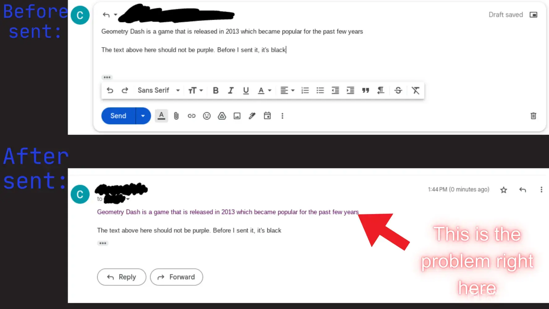 14. Emails turning purple or leaving it blank: In addition to the email thing above, this causes colorblind issues. While I'm not colorblind, colorblind people could possibly have one of these issues right here (all of these things if the text is purple for a normal person):