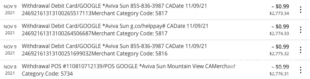 4 charges to my CMCU account all mysteriously for 99 cents and consecutive. I had to google to even know what the H3ll " aviva sun " even was? not impressed that i had to cancel a card and have no card now for a week! i have deleted nearly all google apps from my phone now and will never buy anything from GOOGLE. The strangest part is my google account does not have my checking account information on file ( supposably).