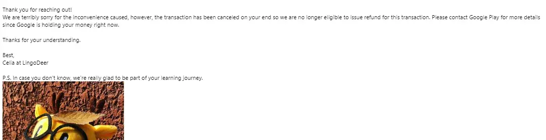 The subscription was subsequently cancelled. I contacted lingo deer requested a refund. Lingo deer complied and indicated funds would be returned. I waited and contacted lingo deer again. Lingo deer stated the subscription was cancelled and that google pay is holding my refund.