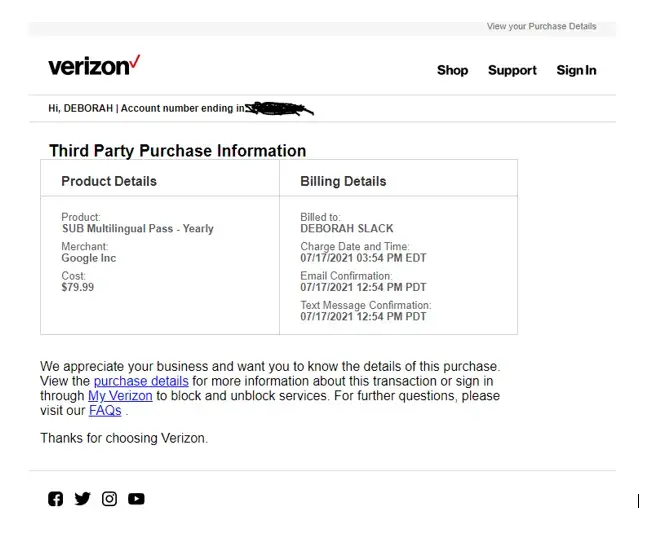 On July 17, google pay request and received funds from my Verizon account for a subscription.