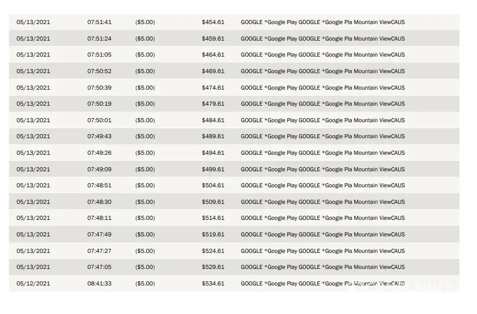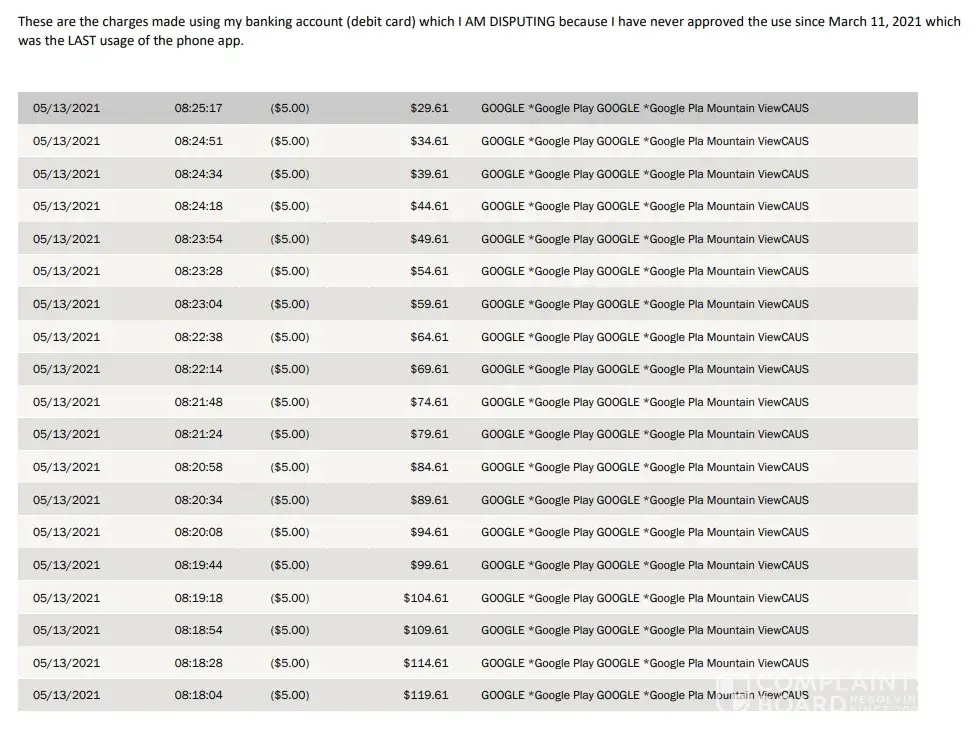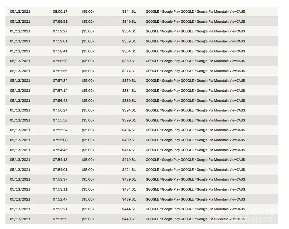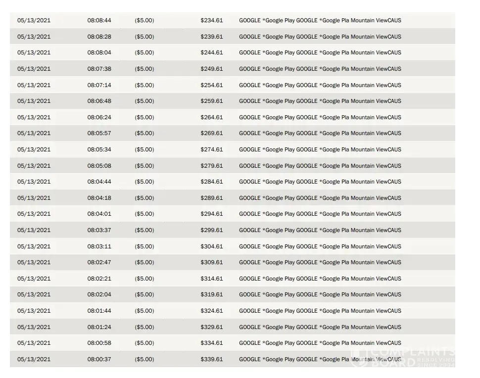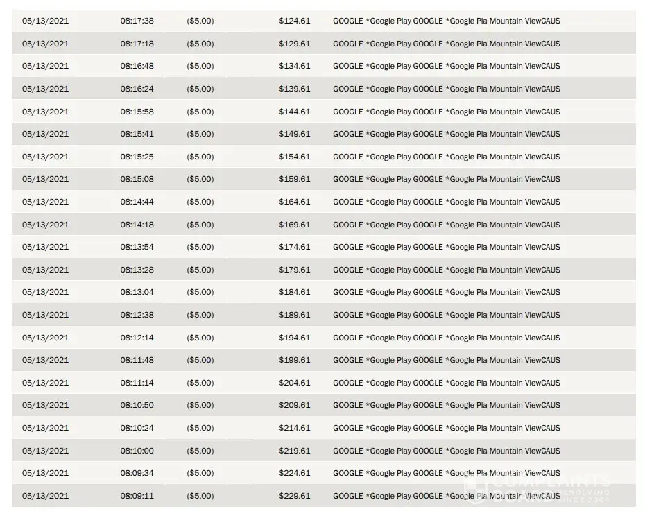 On 5/12/2021 Google Play billed my debit card for $5 and then on 5/13/2021 Google Play billed 100 times for $5.00. Total: $505.00! It took an hour and half for them to charge it every 7 sec to get there.