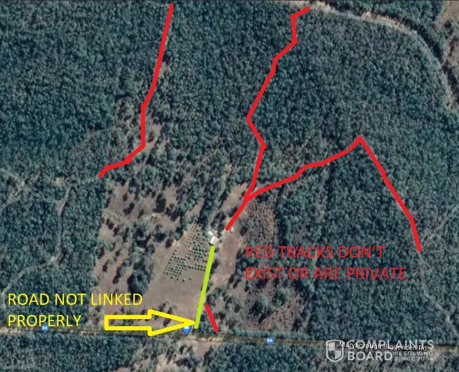Aside from the wrongly identified tracks, the main problem is the road leading from the house to Route 86 stops short and therefore is not linked.
