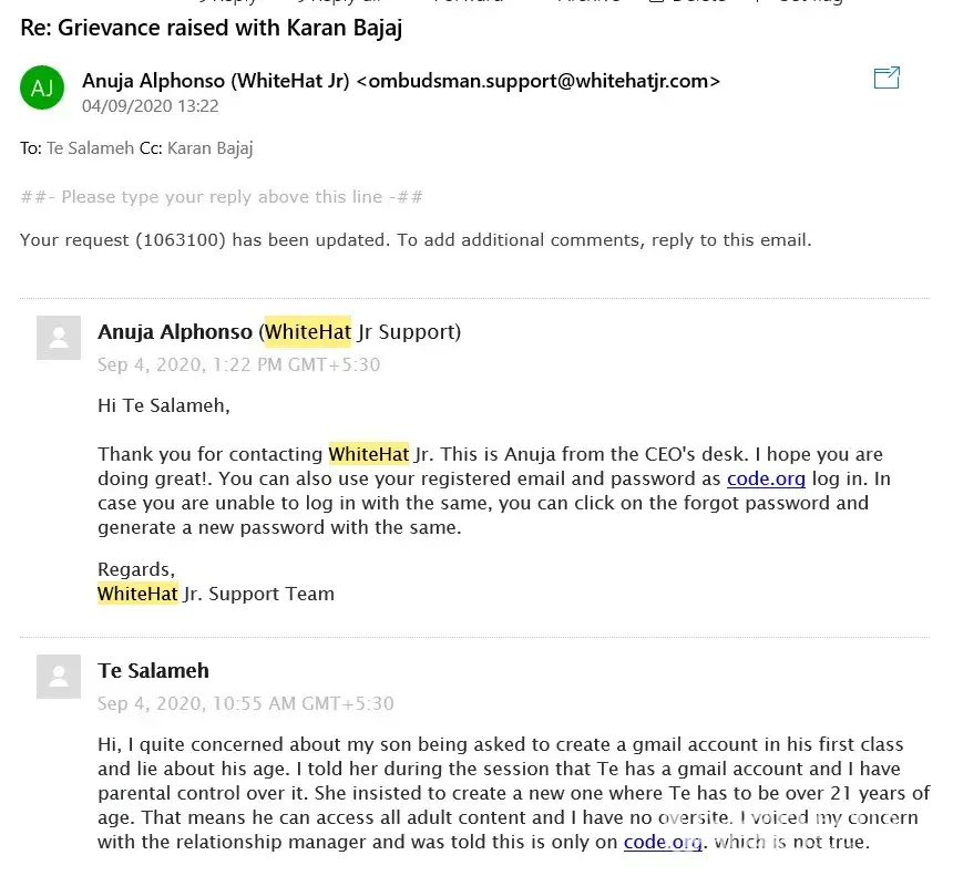 I first online class with whitehat junior the teacher asked my son to create a new gmail account in order to sign up to code.org.