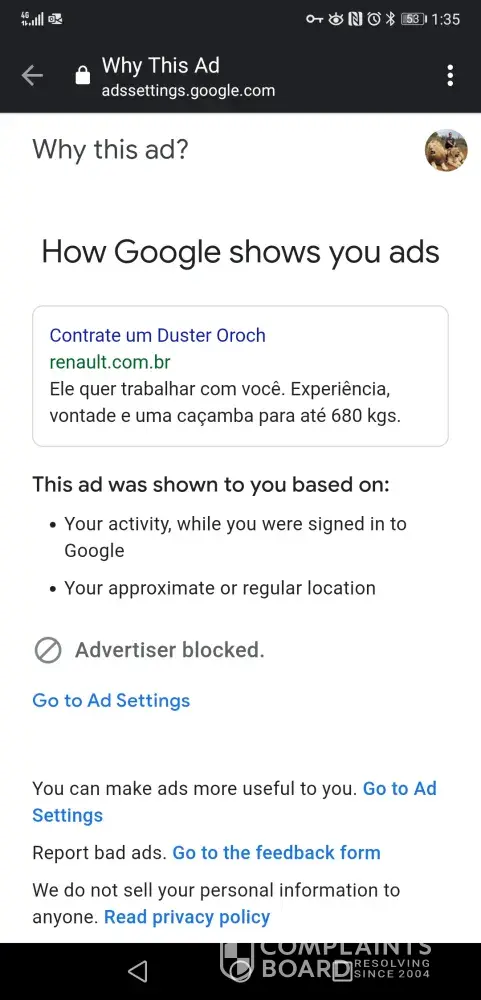 Hi - I keep receiving ads in a foreign language that I dont even understand - keep on blocking them but they just appear again! I've always been english! Cant be based on my activity while I was signed in to google and I live in south africa - think the screen shot is spanish? Whatever changes were made in the background pls fix them asap. Tried to purchase sw to block ads but even this doent work!
