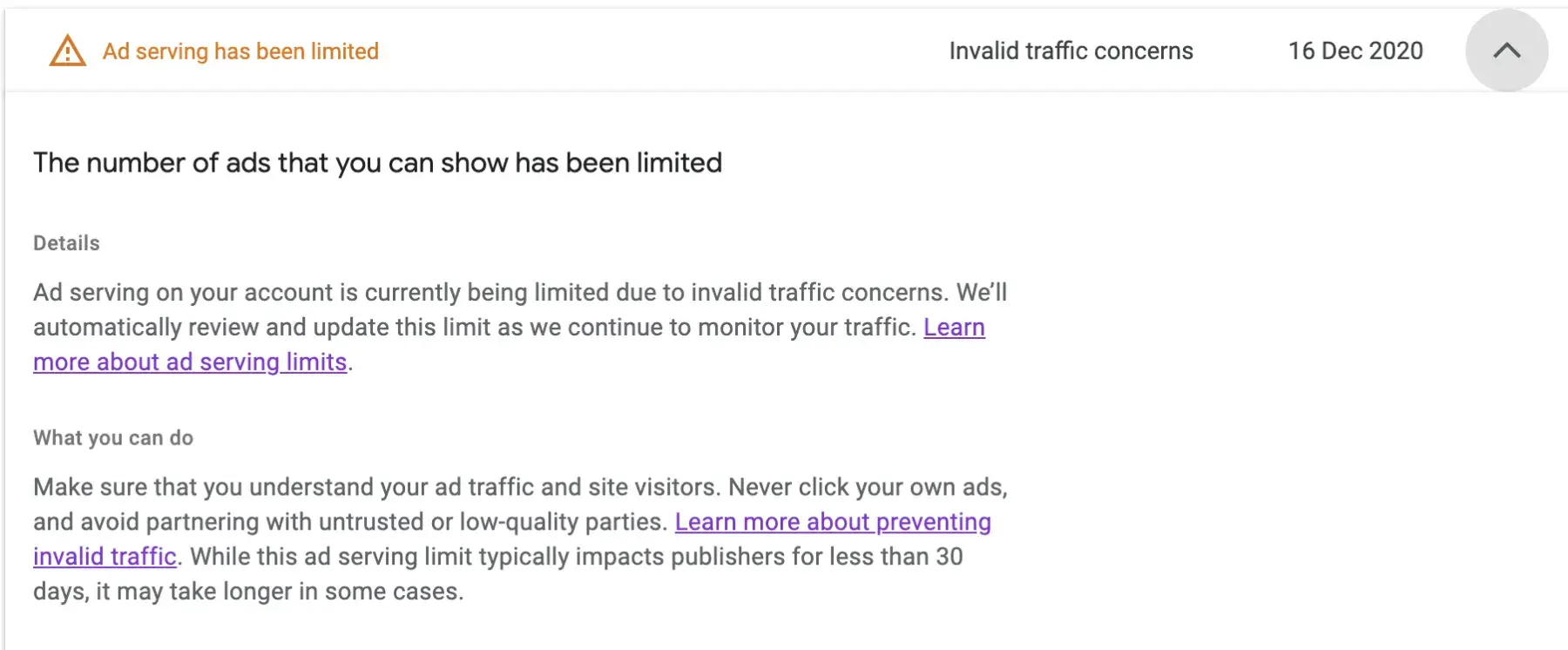 AdSense has enacted the following on my account "The number of ads you can show has been limited. For details, go to the Policy centre."