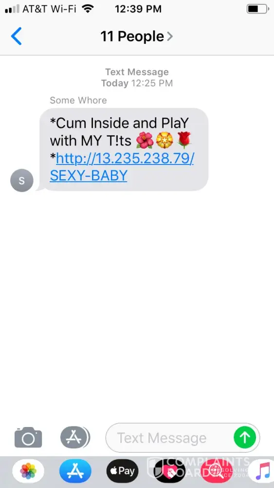 To my work cell I received a lewd text from email "[protected]@gmail.com." Why do you allow some hooker to contact me through my work phone? I want you to stop this today. What responsibility will you take to resolve this and make sure it doesn't happen again? My work cell is [protected]. This was sent to me and 11 other people who probably don't want this crap either.