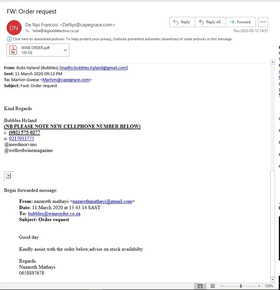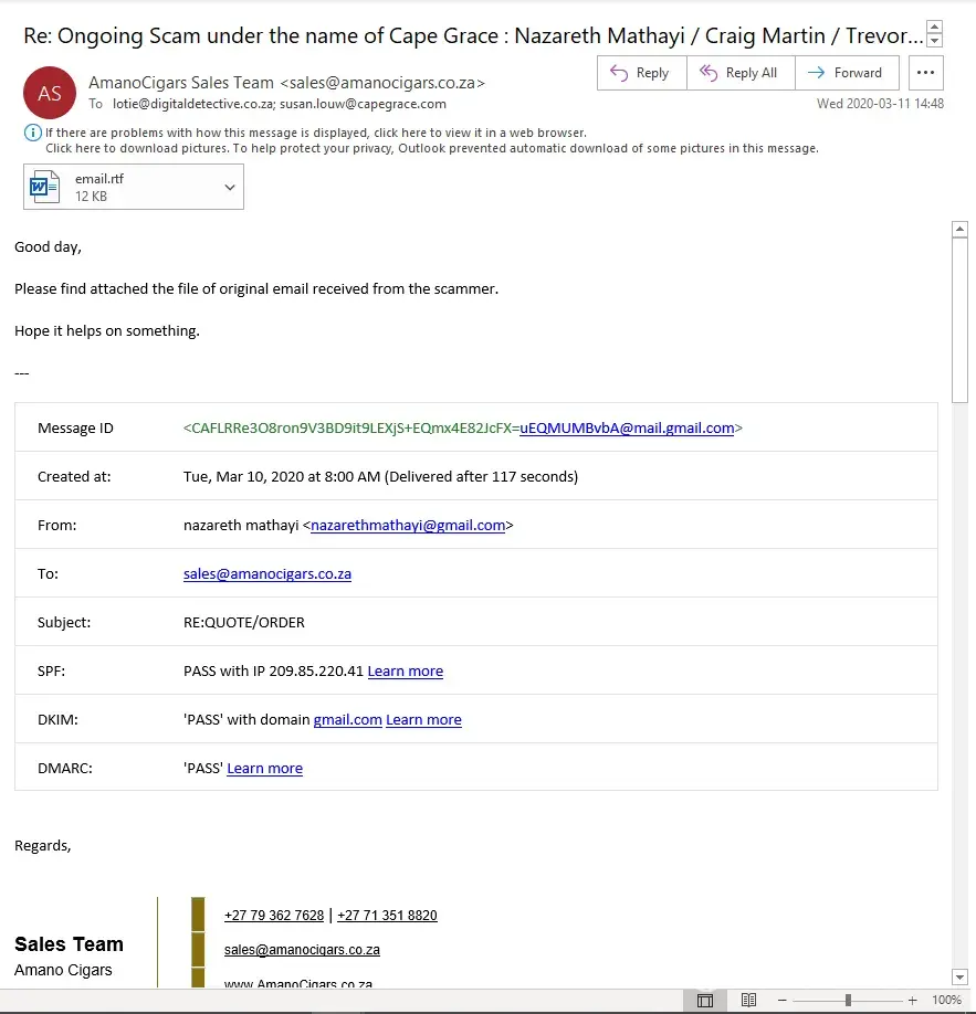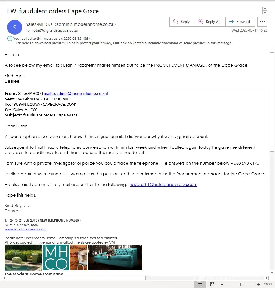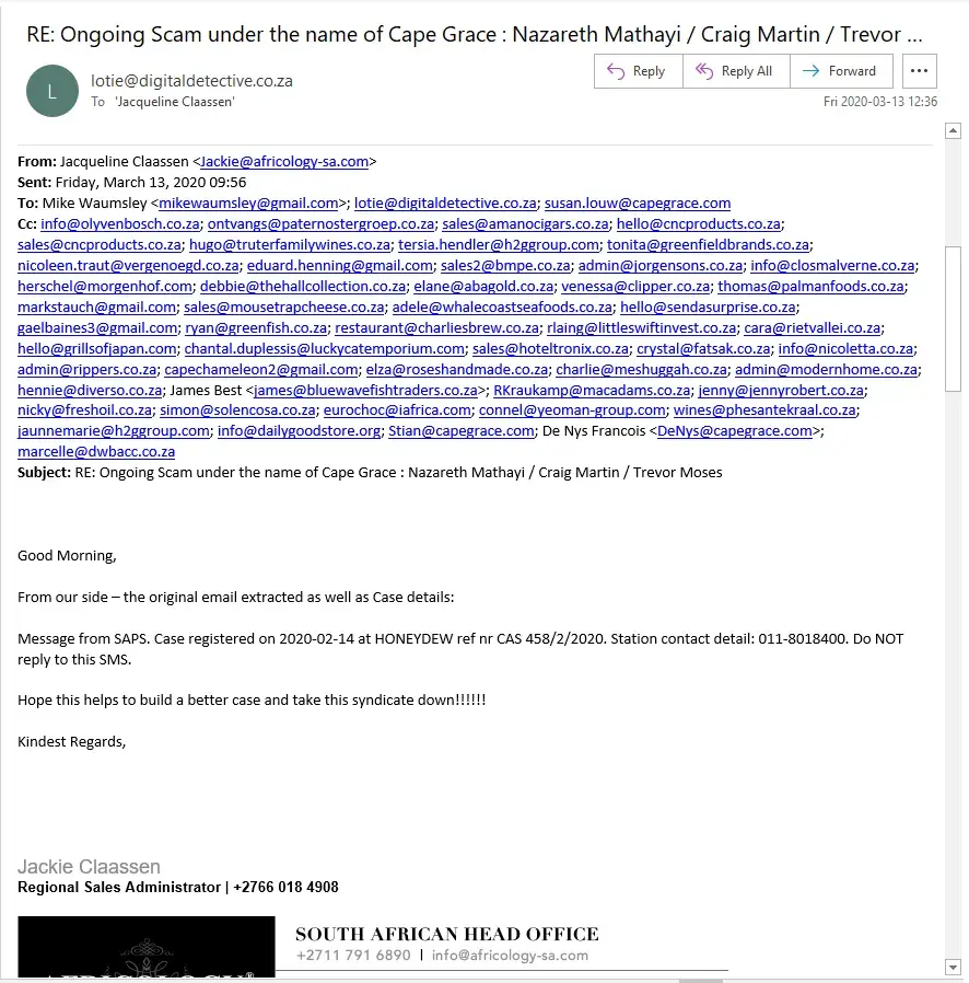 Persons implicating to be employees of Cape Grace Hotel, Cape Town, by names "Nazareth Mathayi", "Craig Martin" and "Trevor Moses" have been scammingservice providers into supplying product, which were then stolen. The fraudulent domains and gmail are: [protected]@gmail.com, www.masscashgroup.com, www.hotelcapegrace.com and www.capegracehotels.com. All the domains are registered through Google.