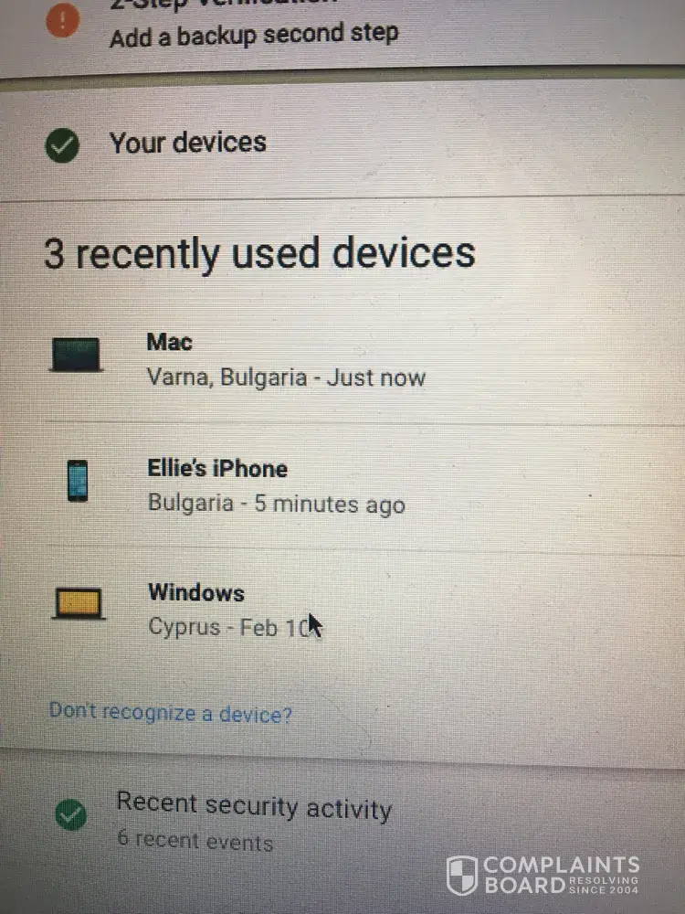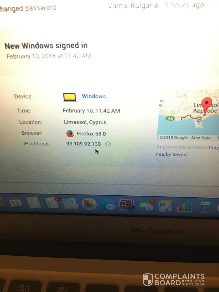 I have no longer access to my email account! I also noted that he changed the verification questions that I used to have and maybe even added another telephone number but for that I don't know! This person device was located at Limassol Cyprus, from Firefox 58.0, IP address: 93.109.92.130, February 10, 11:42 AM from windows it is an unrecognised device and I tried multiple times to remove it or even report it but he was keep changing my passwords and at the end he managed to change also the verification questions as I said and now google is sending me text messages to my personal phone which is [protected] (cyprus) but then when i enter the code it makes another verification question which I DIDN'T put!