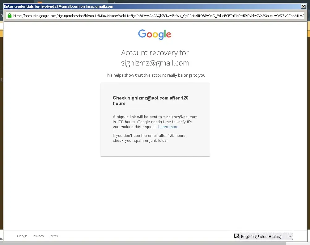 on Mon Jan. 9 a message came up that a code would be sent in 48 hours through another email account - [protected]@aol.com (surprised it was still there), today I received message that another code will be sent in 120 hours!