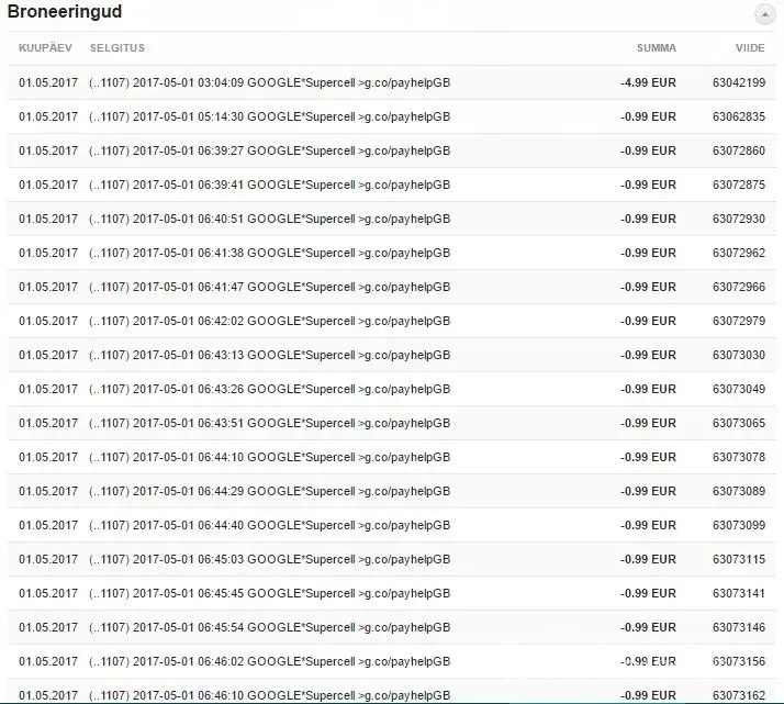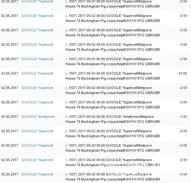 I've been charged almost 30 times 30.05, 1.05 and 2.05.2017. the text on bank says: [protected]:00 GOOGLE *SupercellBelgrave House 76 Buckingham Pg.co/payhelp#SW1W 9TQ GBRGBR