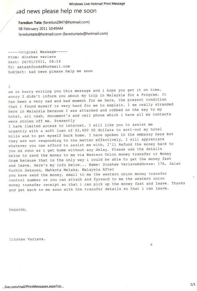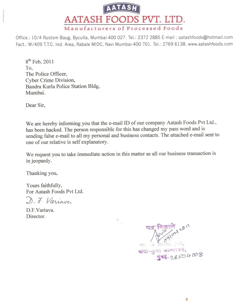 Please refer to the scans. We no longer can access our email id because it has been hacked. However this ID is of great significance to our company 'Aatash Foods' because it has details of our company. We have attached the scans of the police complaint and the previous email recieved by one of our contacts from the hacker. Our old email id is '[protected]@hotmail.com' which we want to procure in order to continue using it. If you require any other details please contact us on our standby email id '[protected]@hotmail.com'