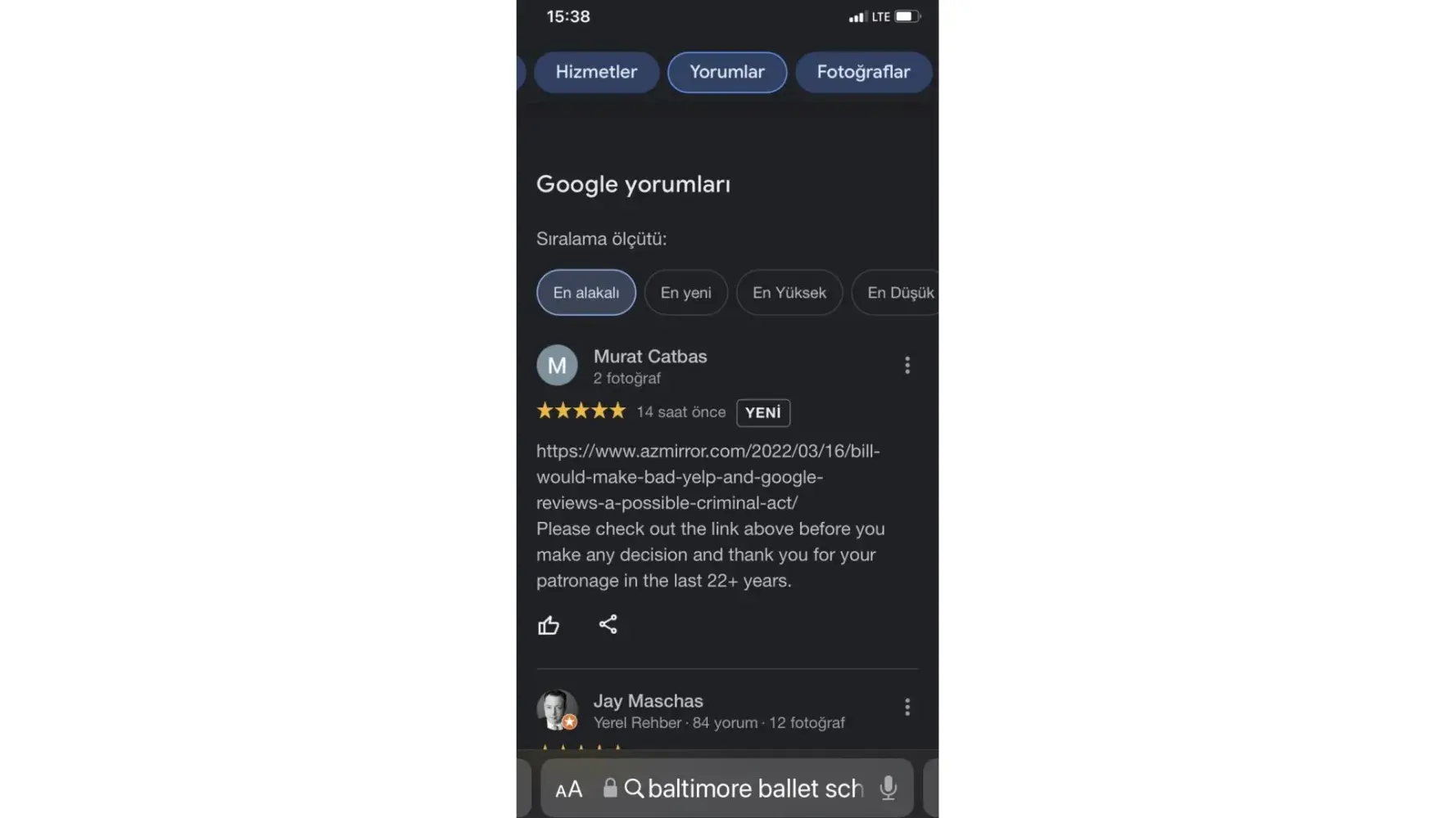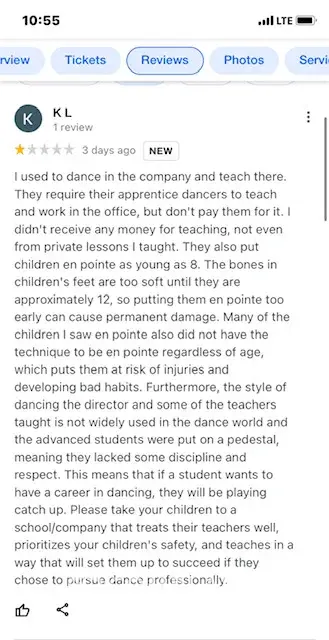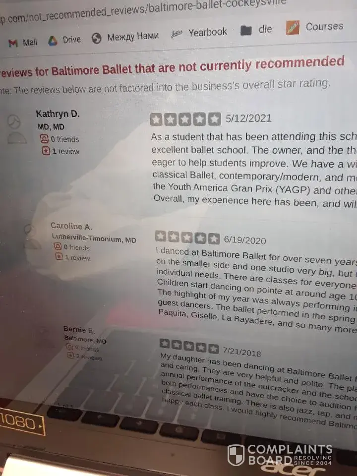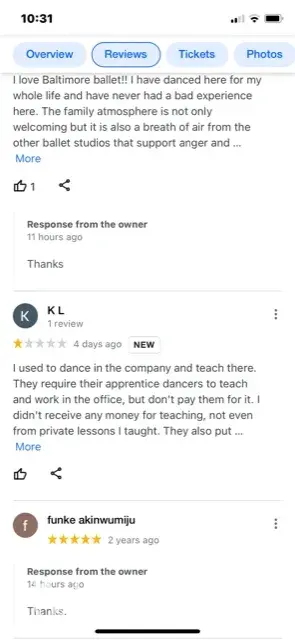 My students, parents, dancers and I have photographs proving that Google may have been blocking close to all positive reviews while generating/allowing negative reviews from unbeknownst accounts for Baltimore Ballet School and Company. We also have proof that Yelp has been practicing similar strategies as well.