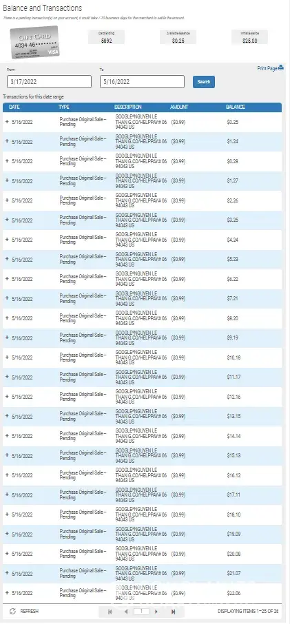 Hello, i recently got a card (Gift card visa) for my 20th b-day (05/14/22) she (put $25$) on it. i checked my balance on https://mygift.giftcardmall.com/ it says GOOGLE*NGUYEN LE THAN G.CO/HELPPAY# 06 94043 US has charged you 0.99$ 24x. on the card it says that there will be no charge fees after purchase. i calling the company they said talk to you.