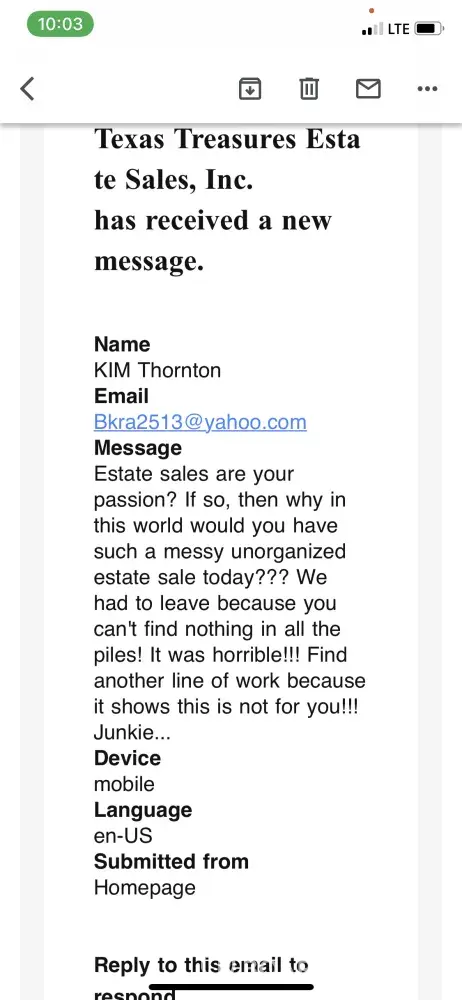 I went to a estate sale through this company today and it was the most unorganized trashiest estate sale I have ever encountered! We had to walk out because you couldn't see nothing because everything was piled in boxes and all over the floor!