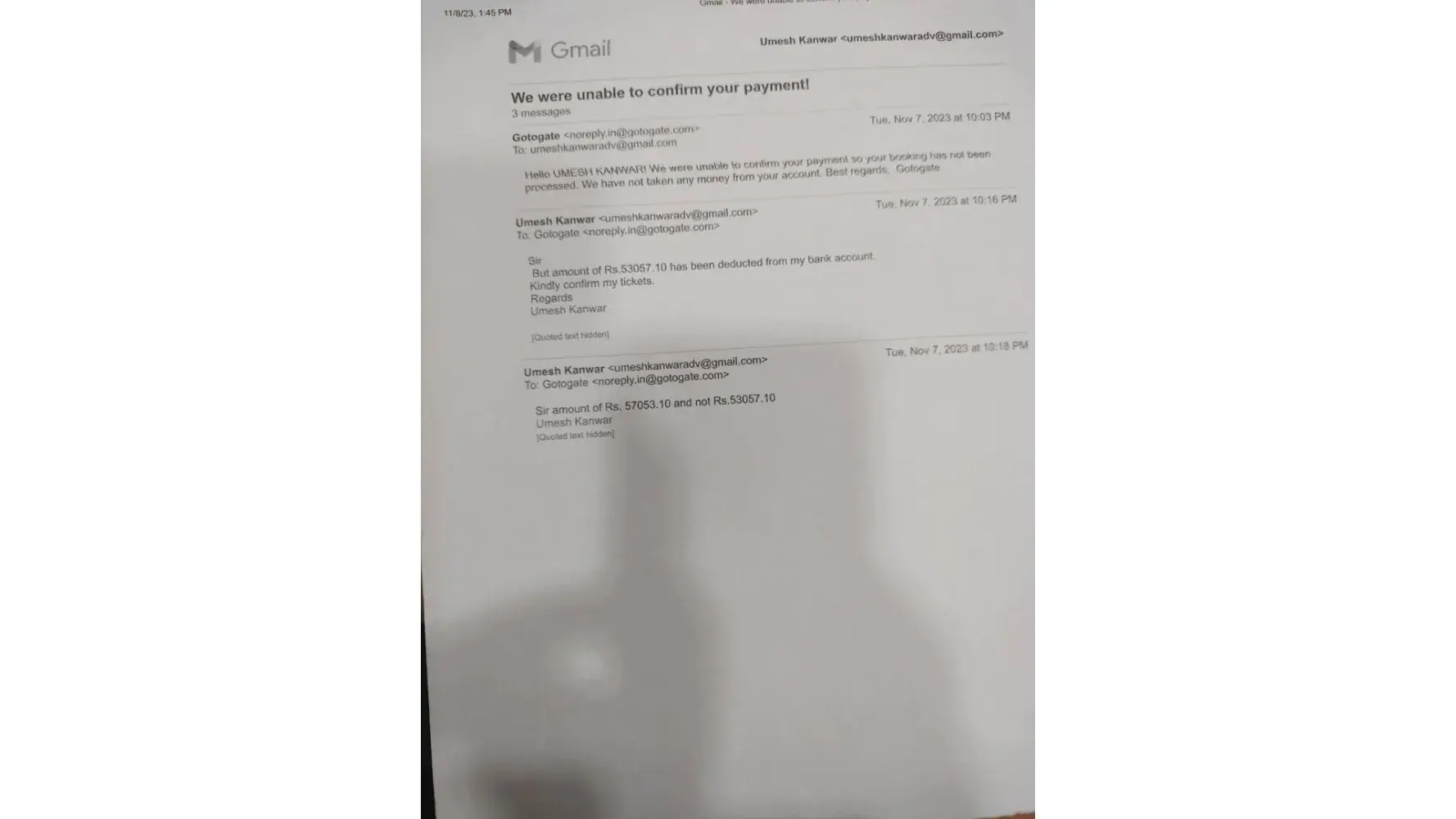 I booked 5 domestic flights tickets from gotogate on 07.11.2023 at 10.00 PM. Chandigarh (India) to Ahmedabad (India) and return, Amount of Rs 57035/-was deducted from my UCO bank account but tickets were not confirmed. As per Bank message transaction was through DLOCAL North West de. Gotogate by mail inform me that they did not receive the amount.