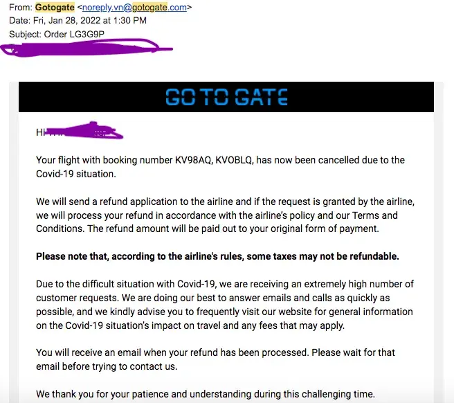 My flight got canceled due to COVID, and I never received any refund for my 2 tickets I called many times customer services and everytime it's the same answer ''please wait'' or even they don't reply particularly +[protected]( worst gotogate customer line ''DONT CALL THIS NUMBER'', they dont picked up the phone call or they cut off the call without answering). Today 17th of March 2022 I called the airline company and they tell me that the refund has been sent to Gotogate 1 week ago. I called them again (gotogate) and they told that they didn't receive anything from the airline compagny.