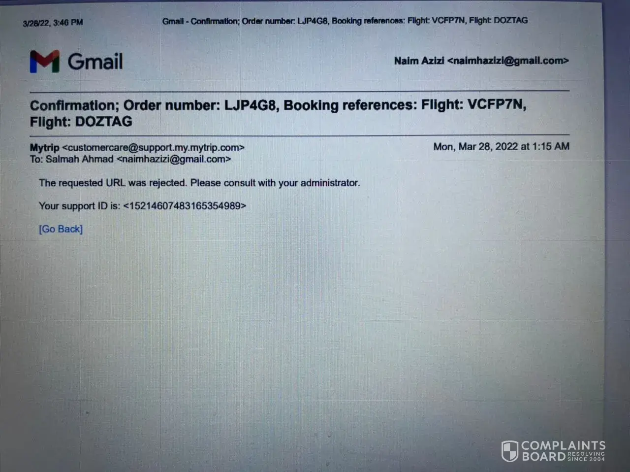 On 28th March 2022 at 1.00am (Malaysian timing) I was trying to make a roundtrip booking Kul-Perth via MyTrip from SkyScanner.com. The several attempts made was unsuccessful as the browser kept getting processing error on the webpage (Please refer to "Exhibit A"). Then at 1.15am on the same day I received an email detailing that "The requested URL was rejected. Please consult with your administrator." (Please refer “Exhibit B”). I triple-checked and there was still no confirmation nor travel documents sent to me. As a result of the rejection request email, I was led to believe that no bookings were confirmed.