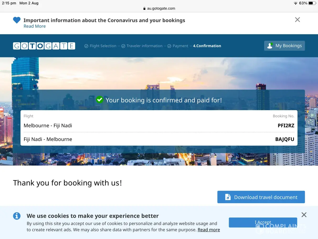 Mijn vlucht werd gecanceld wegens covid. De luchtvaartmaatschappij betaalde gotogate maanden geleden terug, maar gotogate stort het geld niet door. Ik kan hen nergens contacteren : "mijn boeking" herkent mijn reservatie niet, alle telefoonnummers van europa heb ik geprobeerd ofwel zijn ze buiten gebruik ofwel krijg jee een bandje "we helpen u zo dadelijk". Als je mailt krijg je een automatisch antwoord "je boeking is 60 dagen oud en dus geen I info meer beschikbaar"... Het gaat over 2 business vluchten van 4000€ die gotogate schaamteloos achterhoudt. Enige mogelijkheid zal de rechtbank worden. Boek nooit meer met gotogate!