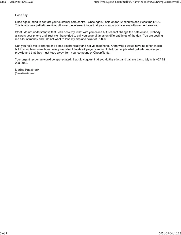 I do not know what to do anymore. I have no success with emails or telephone calls and my airline ticket is going to expire on the 27th of August. My order no is: L8KSZU.