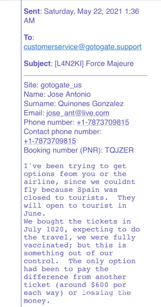 We couldnt travel because Spain was closed to tourism by May 15, 2021, we tried to change the dates or get a refund. The airline says that since we bought the tickets by www.gotogate.com they are the ones that have to gave us options. Its been like a back and forward and still haven't had any options (a refund or alternative tickets). We called and wrote many times.