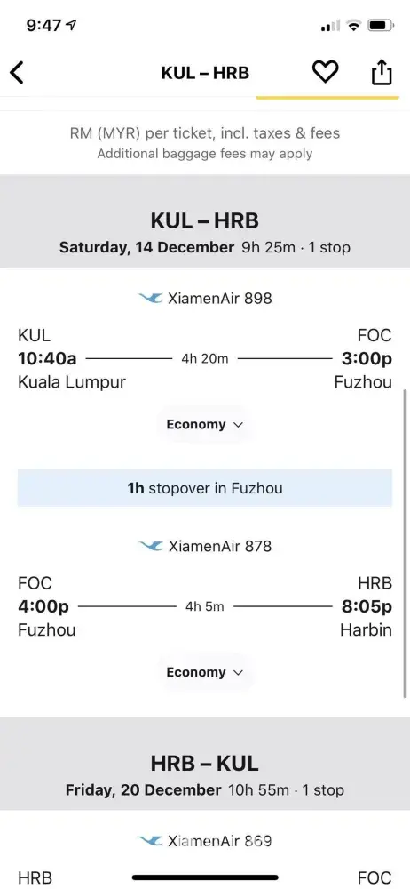 I've book a round trip flight from Kuala Lumpur to Harbin on 14/12/2019 to 20/12/2019.