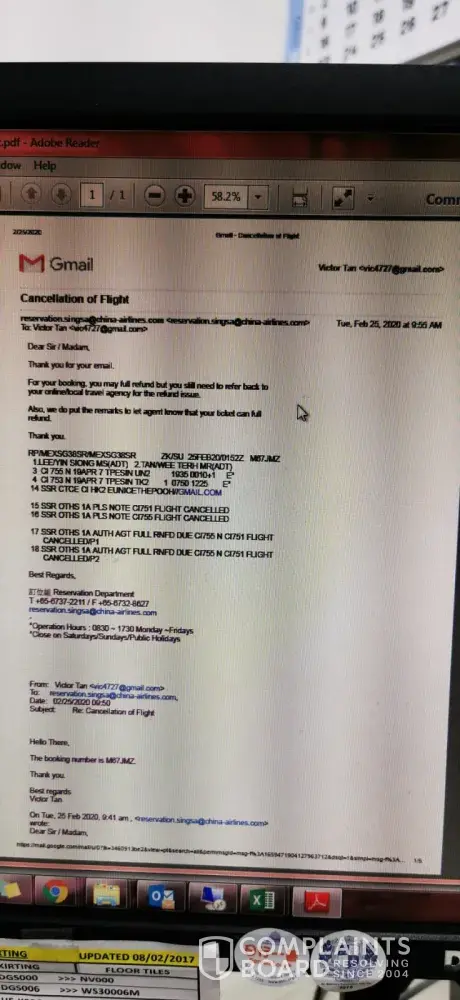 We saw the news on China Airlines website mentioned that our booking flight on 19 April 20 from Taiwan to Singapore is affected due to Novel Coronavirus. We called your company on 23rd Feb to check and want to cancel the flight and your colleague mentioned that we need to get approval from China Airlines in order to get full refund because our original flight is noon but due to delay had been changed to night. So we contacted China Airlines and they reply us via mail mentioned that we are allow to get full refund and will put a remark to let agent know. After that we try to call back your company but always nobody pickup or the phone ended when your colleague transfer us to another department. Then we send 1st email and only replied us mentioned already send request to support team and no more reply after that. Then we use that reply to reply back and the answer we get is the request is closed and concluded. Our problem haven't settle how come the case closed and concluded? Then we send 2nd request for cancellation and include the reply we get from China Airlines but till now didn't get any reply.