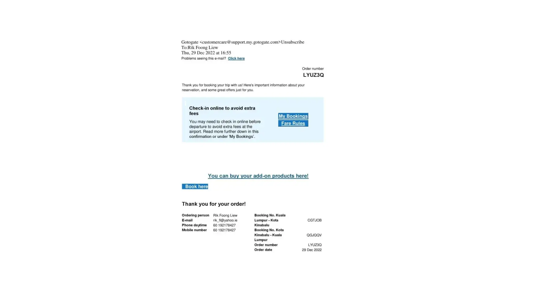 on the 17th of January I purchased a flight from Lahore to Jakarta, and then a minute later purchased another flight from Paris to Lahore. Both purchases were made on Gotogate. I went to sleep as it was late. the next morning I wake up, go to work and when I return I begin organising my tickets in my email.