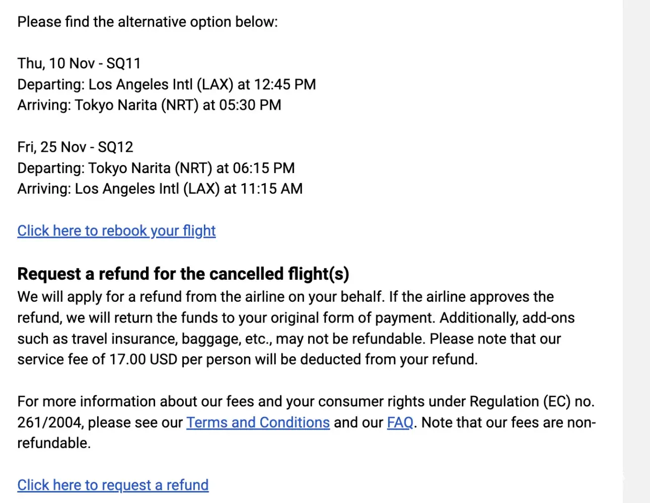 Desired outcome: I would like a refund or I would like to rebook with no hassle and no penalty fees.