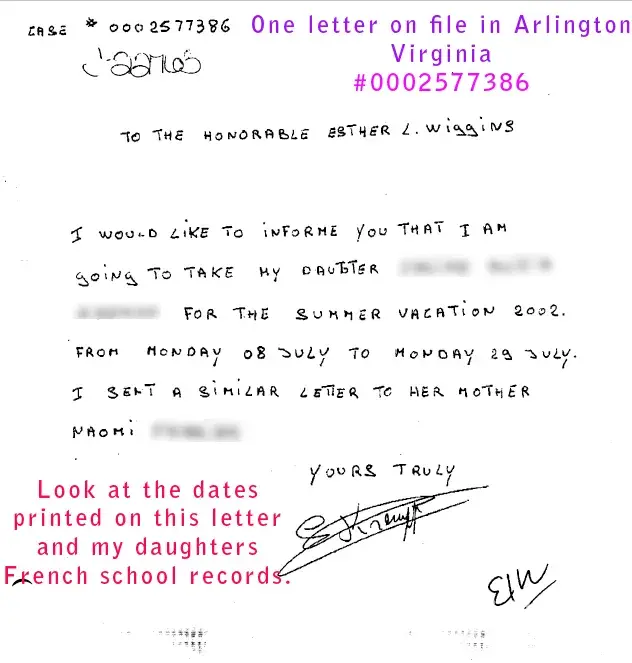 The last time I saw my daughter she was 7 years old. She was unable to speak English because her biological father abandoned her in France with his relatives for nearly six years. He maintained an elaborate compounding lie in the court room of Judge Esther Wiggins Lyles, pretending our daughter resided with him in Washington DC. Esther Wiggins allowed a man...
