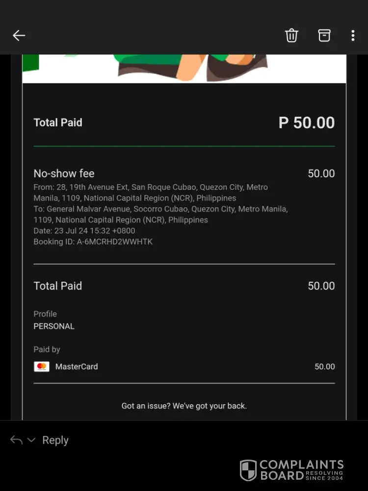 On top of this, I found my credit card was charged Php 111.00, the original booked price for the ride and Php 10.00 aside from the Php 50.00 I paid for the 'no show' fee.