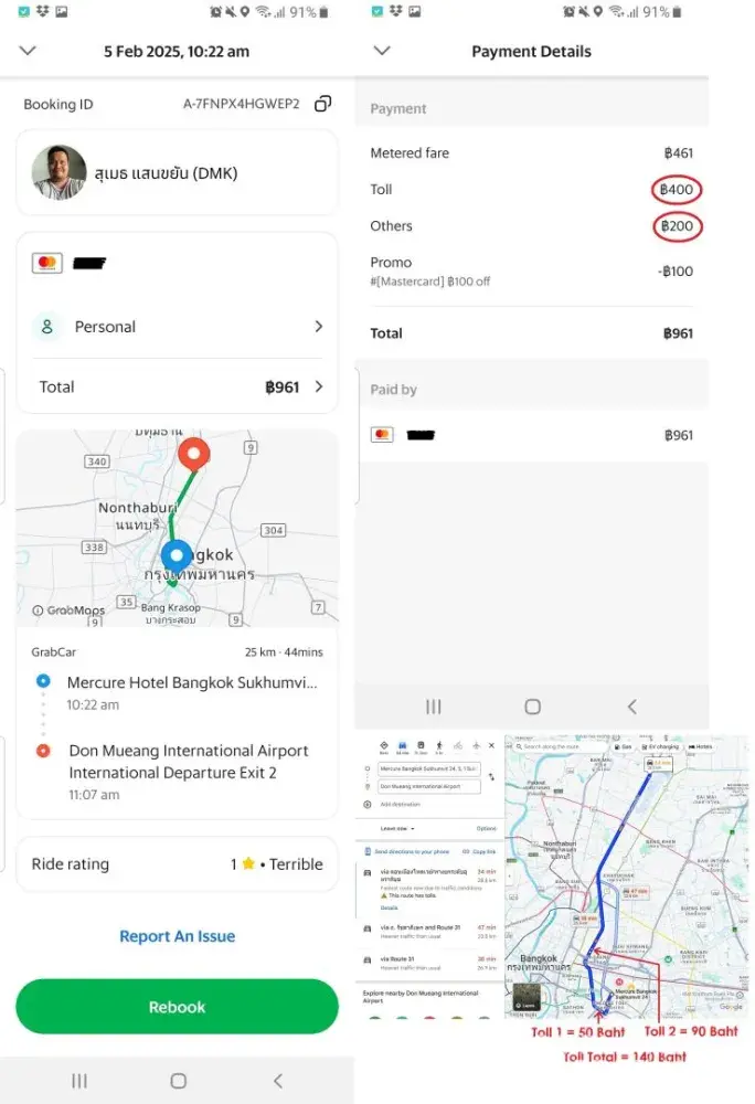 Beware of this Grab driver. He charged an extra 460 Baht to my credit card for my ride from Mercure Hotel Sukhumvit 24 to Don Mueang Airport, Bangkok on 5th February 2025. The toll was only 140 Baht but he charged 400 Baht, and there was nothing that warranted a charge of 200 Baht for "Others". I had only one small cabin bag. Stealing is a crime. I...