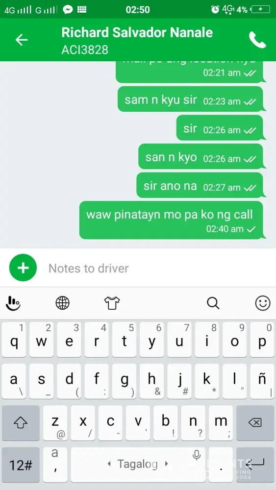 We booked at around 1:57pm and it showed that he is 2 mins away from where we were. When it became 1min away, we are trying to call him several times but he is not answering our calls. We instead, sent him a message in grab app asking him "nasaan na po kayo? " and he replied "nagmamadali kayo sir? " then we replied "yes medyo" because we are about to meet someone in la nueva supermarket. He then replied saying that hindi naman instant pagkabooked eh makakarating siya agad sa lugar namin kung ganon e ka cancel na lang nya, then he cancelled the booking.