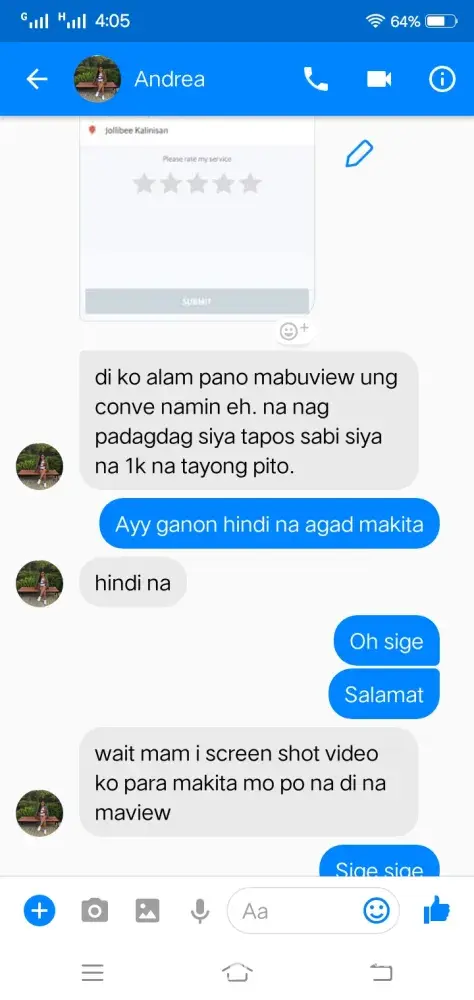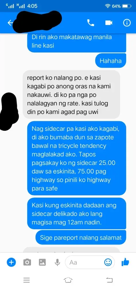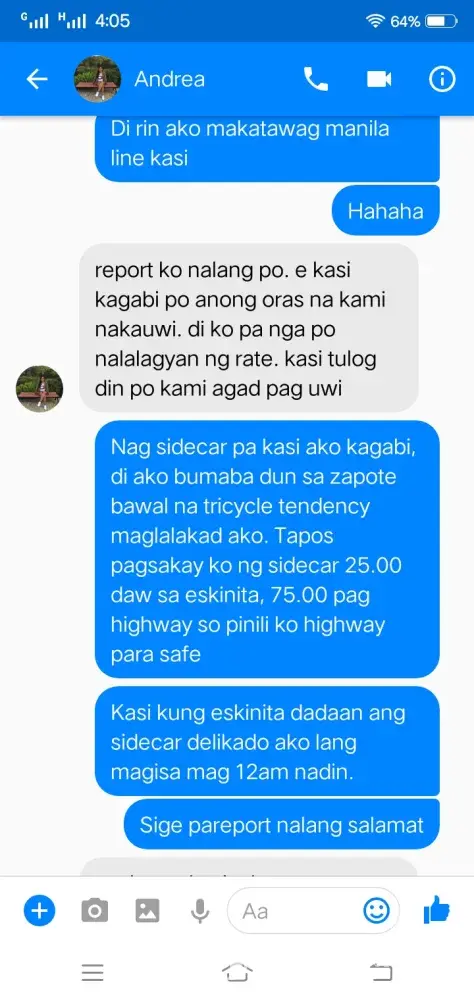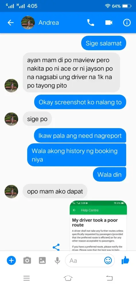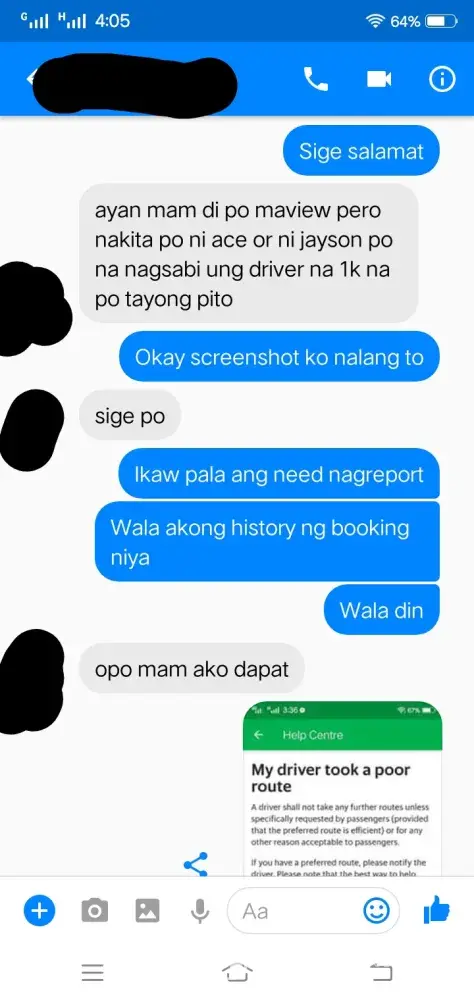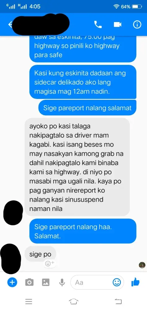 Complaint: My driver took a poor route. Nung nakasakay na kami tsaka niya lang sinabi na hindi siya sa coastal road dadaan sa C-5 ext. lang daw ang way niya dahil traffic daw at walang maibigay sa kanya na way yung app. Then nakiusap ako na baka pwede idaan sa coastal dahil 1 ako sa baba sa may Boundary ng Las Piñas at Bacoor sa may Longos, ang insist niya di daw pwede kesyo bawal daw magbaba ng paisa isa which is ako lang naman ang bababa at near na ako sa pintuan ng kotse para mabilis. Nung patuloy padin ako sa pakikipag-usap dinaan niya kami sa malubak na daan tapos biglang preno na alam ko namang nananadya. Nakakainis lang na isipin kaya nga nag Grab para convenient ang byahe pero sa experience ko hindi niya deserved mag service ng ganyan. Binaba niya kami sa destination namin ako lang ang naiba dahil dun ako dumaan sa delikadong way at napamahal pa ako sa sidecar imbis na sa mismog Longos na ako binaba. Wala namang pinagkaiba kasi expressway din yun. Isa pa nung nalaman niya na pito kami ginawang 1, 000 from 705. na sinabi niya. Paki aksyunan naman dahil alam naman natin na hindi tama ang inasal ng Grab Driver na yan. Maraming salamat sa inyong tulong at kooperasyon. Kung pwede po malaman kung naaksyunan ang aking complain, sa email ko ([protected]@gmail.com) or tawagan sa number na to [protected]). Salamat More power God bless!
