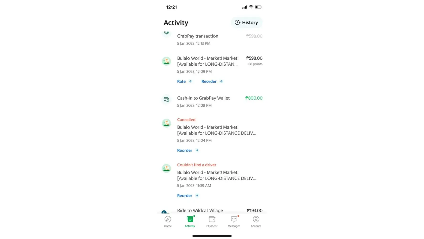 My grab history show no booking and no rides for the day.