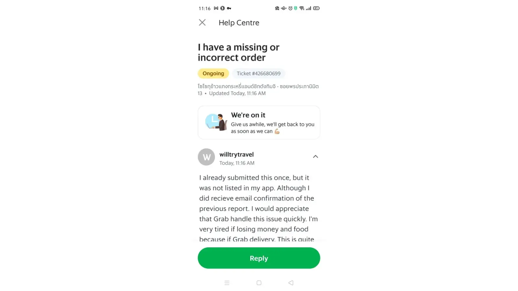 My point is that incrementally, Grab steals from it's customers on refunds/rewards... not to mention all of the headaches involved in trying to get the refunded money. So, I'm cancelling my Grab account right after this is posted. In Bangkok Grab was reliable but we also had Food Panda, which I liked much better than Grab. But in Chonburi, there is no Food Panda. And Grab is horrible. Grab customer service isn't much of a service at all, to it's customers. They always try to short the customers on the refunds. Paying back less than was spent in the product that was ordered. That's why I never use my bank account or credit card with Grab... Cash Only! I've included pictures or wrong food and damaged foods and messages from Grab support.